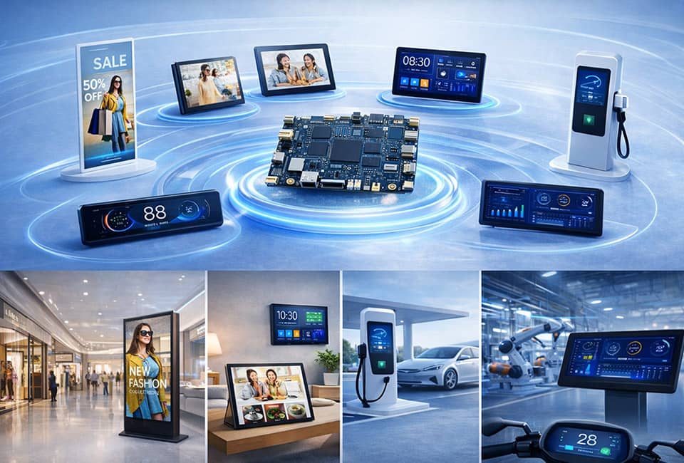 方案广泛应用于商业广告、智能家居中控、新能源充电终端、工业设备及车载仪表等场景。通过AI能力赋能,实现精准内容投放、用户行为分析与高效人机交互,帮助客户提升运营效率与商业转化能力,在同类产品中建立差异化优势。
